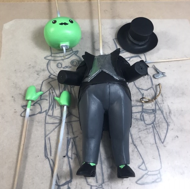 탈착식으로 만든 머리는 떼어놓은 상태고 팔을 붙이고 조끼도 표현해주고, 아래쪽에 보시면 넥타이가 될 파트도 만들어줬습니다.